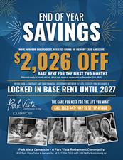 Park Vista Camanche is offering a year end special for those moving in by 12.31.25 in Assisted Living or Memory Care. We will take $2026 off the first 2 months rent and rent will be locked in until 2027.